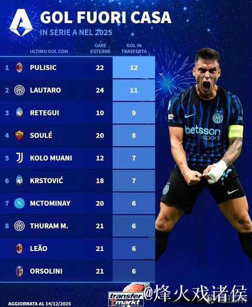 2025赛季的意甲联赛还在激烈进行,但一份最新出炉的“客场进球榜”已经抢先成为焦点话题:AC米兰的美国球星普利希奇以12粒客场进球高居榜首,国际米兰的锋线领袖劳塔罗·马丁内斯则以11球紧随其后。这份榜